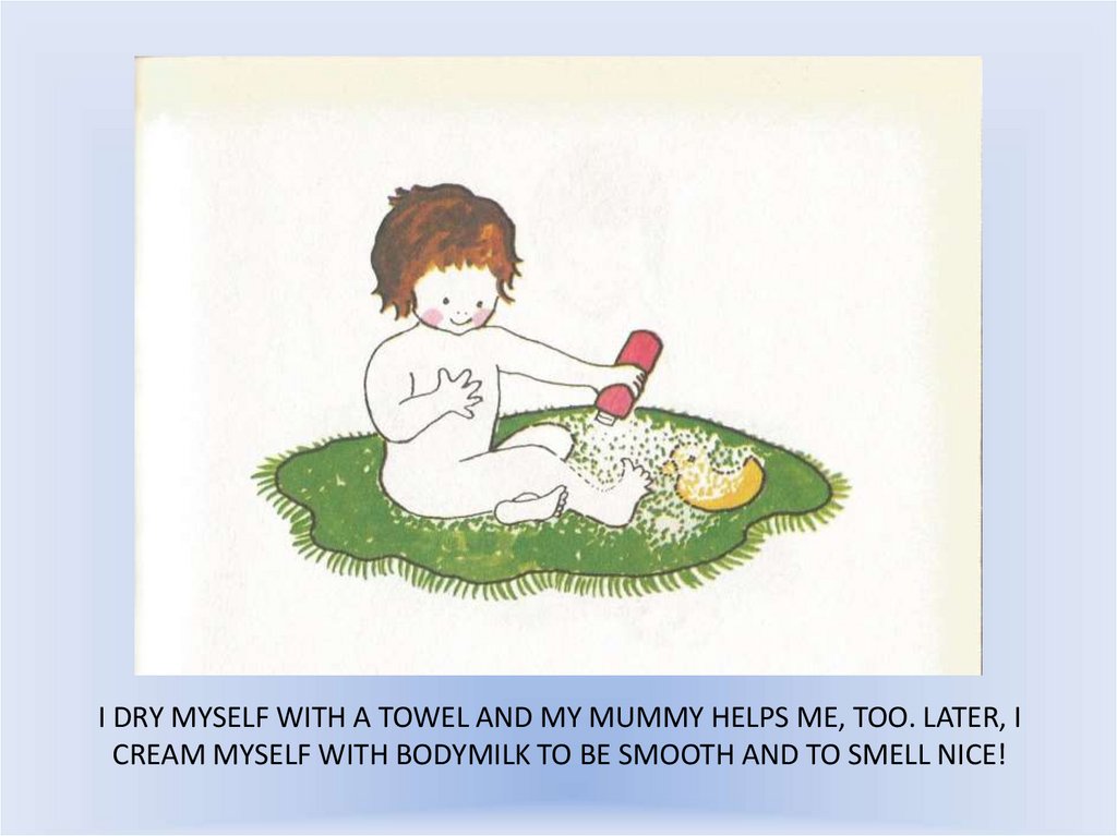 I DRY MYSELF WITH A TOWEL AND MY MUMMY HELPS ME, TOO. LATER, ICREAM MYSELF WITH BODYMILK TO BE SMOOTH AND TO SMELL NICE!