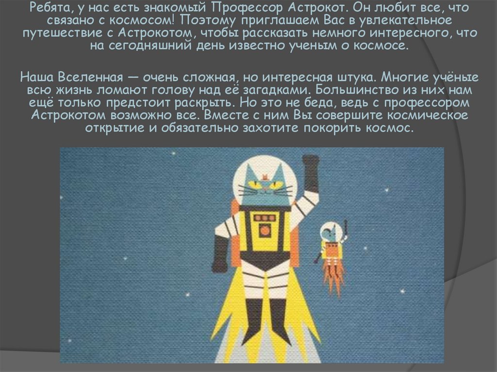 Ребята, у нас есть знакомый Профессор Астрокот. Он любит все, чтосвязано с космосом! Поэтому приглашаем Вас в увлекательное