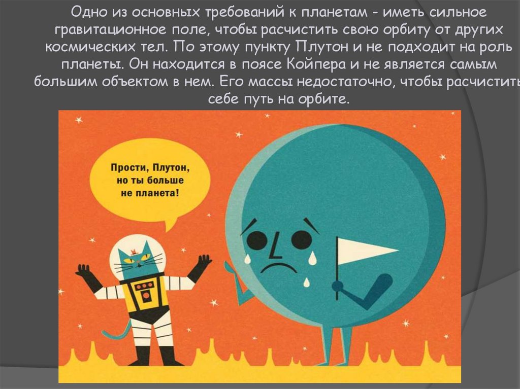 Одно из основных требований к планетам - иметь сильноегравитационное поле, чтобы расчистить свою орбиту от других