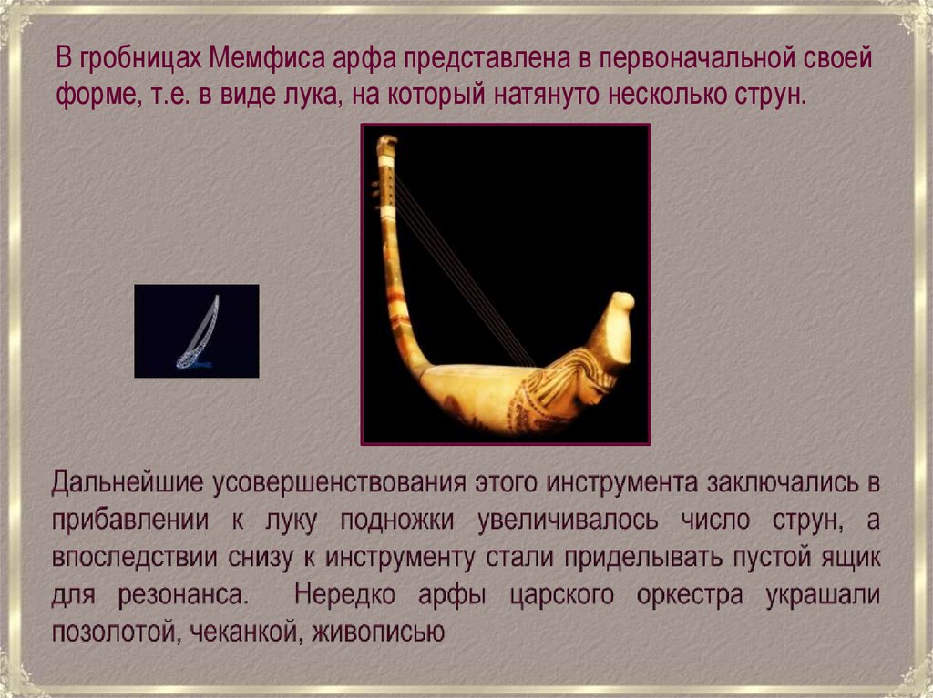 В гробницах Мемфиса арфа представлена в первоначальной своей