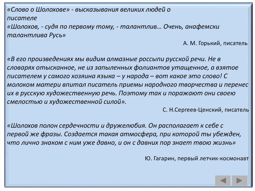 «Слово о Шолохове» - высказывания великих людей описателе