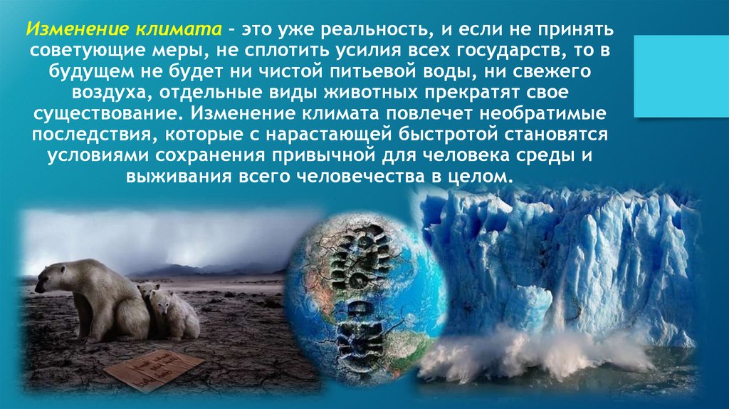 Изменение климата – это уже реальность, и если не принятьсоветующие меры, не сплотить усилия всех государств, то в