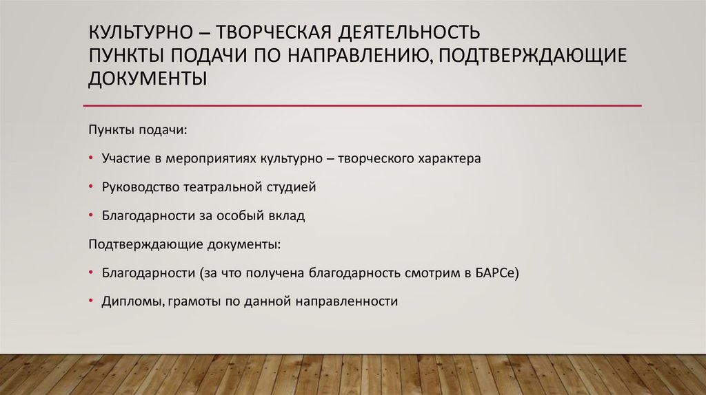 КУЛЬТУРНО – ТВОРЧЕСКАЯ ДЕЯТЕЛЬНОСТЬПУНКТЫ ПОДАЧИ ПО НАПРАВЛЕНИЮ, ПОДТВЕРЖДАЮЩИЕ