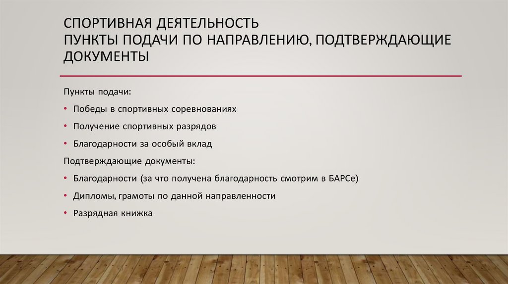СПОРТИВНАЯ ДЕЯТЕЛЬНОСТЬПУНКТЫ ПОДАЧИ ПО НАПРАВЛЕНИЮ, ПОДТВЕРЖДАЮЩИЕ