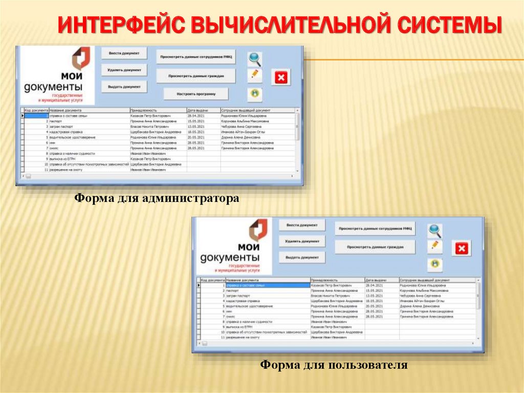 ИНТЕРФЕЙС ВЫЧИСЛИТЕЛЬНОЙ СИСТЕМЫФорма для администратора