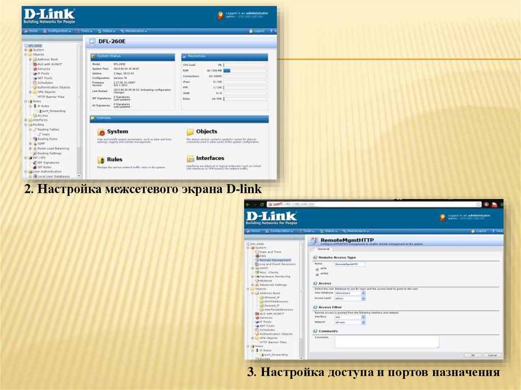 2. Настройка межсетевого экрана D-link3. Настройка доступа и портов назначения