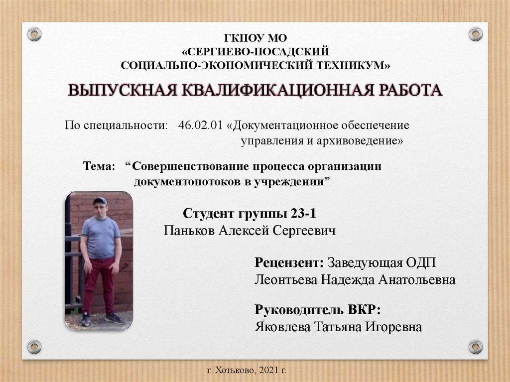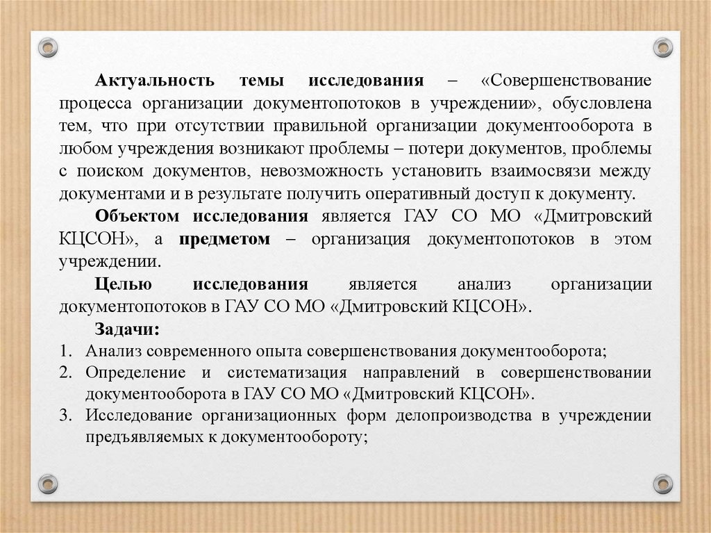 Актуальность темы исследования – «Совершенствованиепроцесса организации документопотоков в учреждении», обусловлена