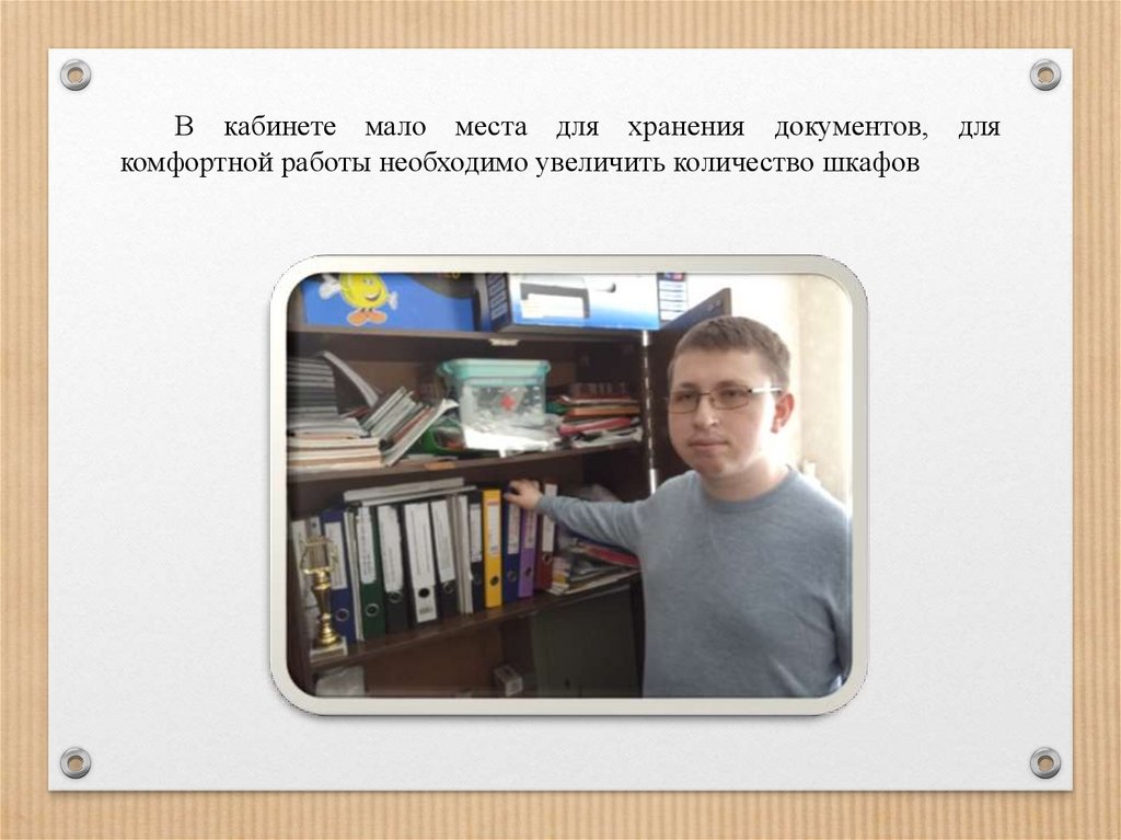 В кабинете мало места для хранения документов, длякомфортной работы необходимо увеличить количество шкафов