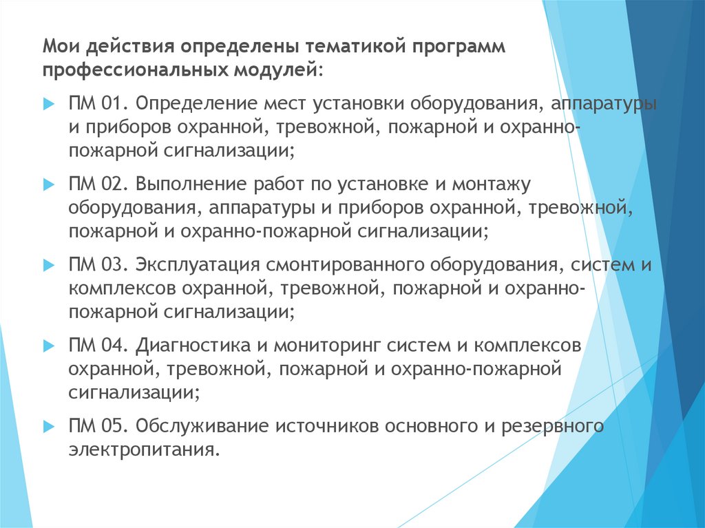 ПМ 01. Определение мест установки оборудования, аппаратуры