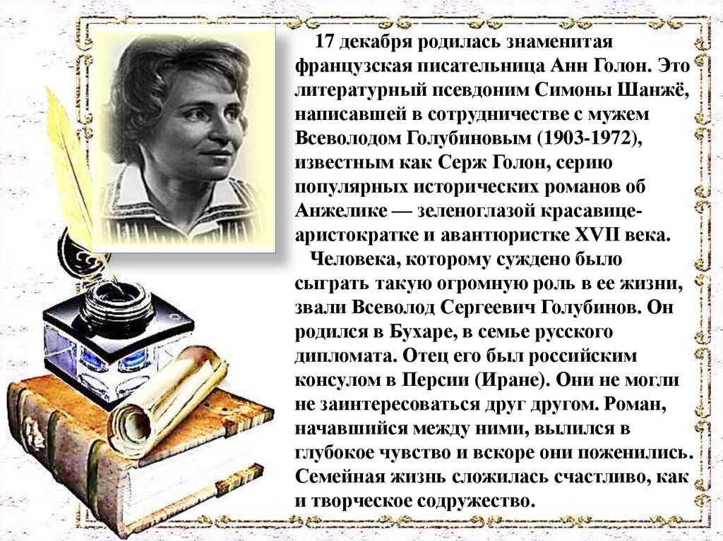 17 декабря родилась знаменитаяфранцузская писательница Анн Голон. Это
