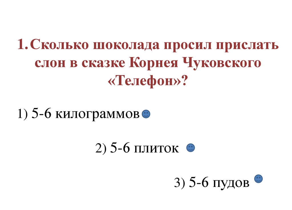 1.Сколько шоколада просил прислатьслон в сказке Корнея Чуковского