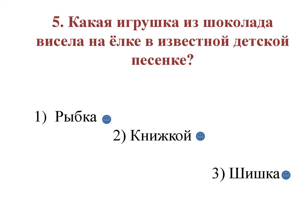 5. Какая игрушка из шоколадависела на ёлке в известной детской
