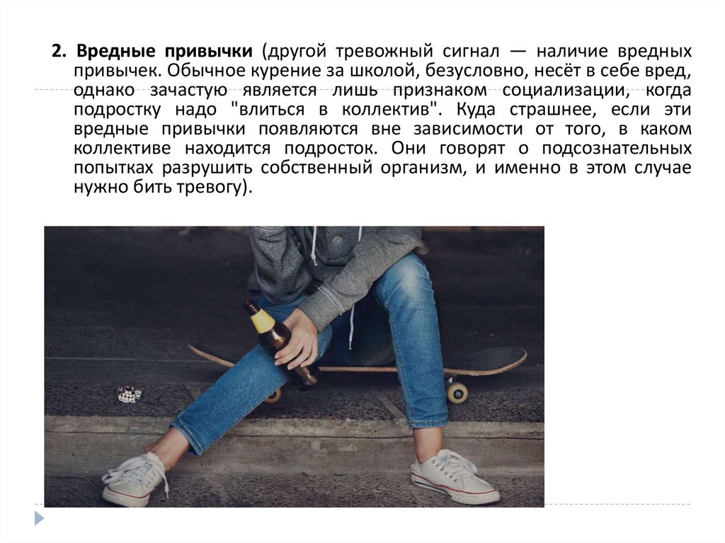 2. Вредные привычки (другой тревожный сигнал — наличие вредныхпривычек. Обычное курение за школой, безусловно, несёт в себе вред,