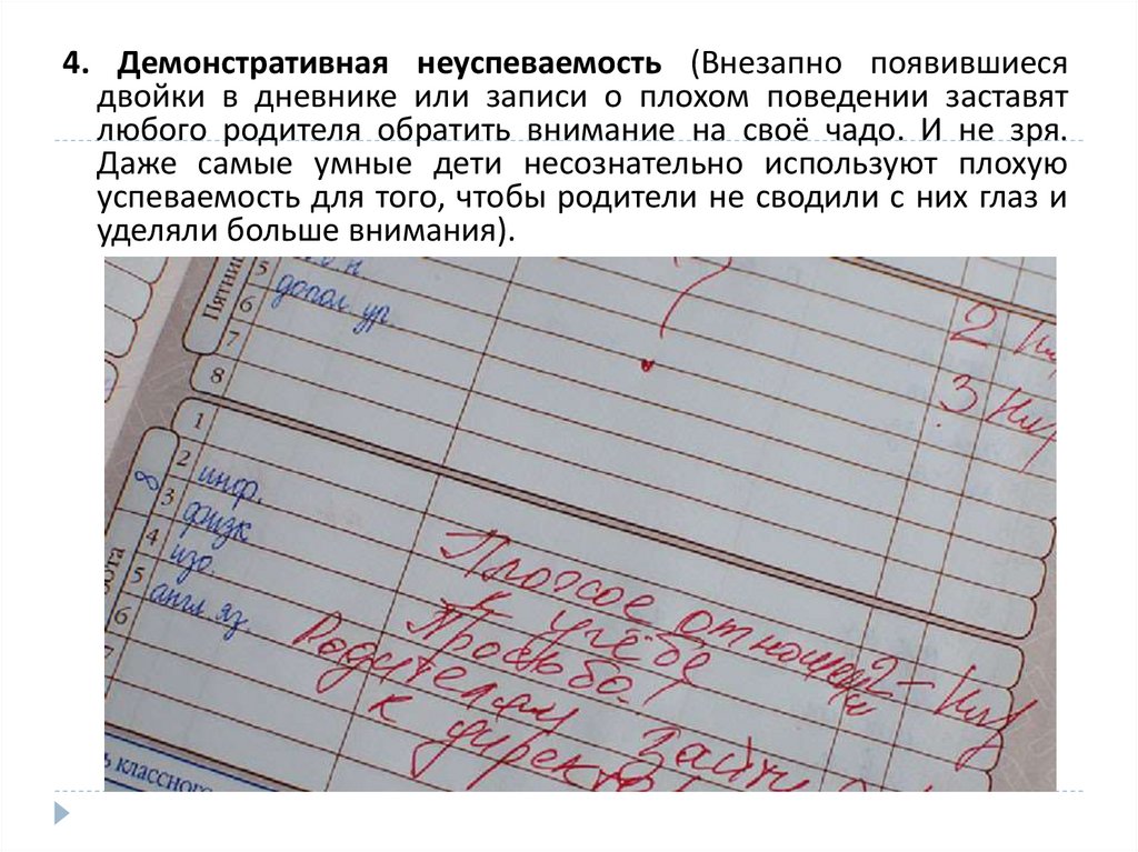 4. Демонстративная неуспеваемость (Внезапно появившиесядвойки в дневнике или записи о плохом поведении заставят