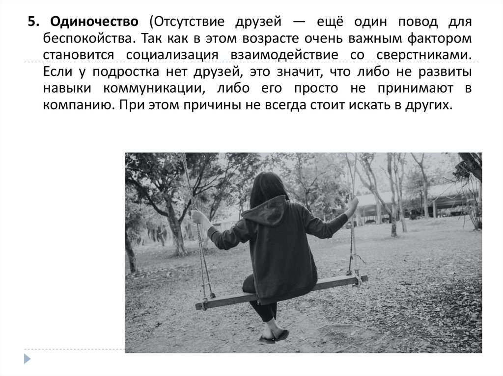 5. Одиночество (Отсутствие друзей — ещё один повод длябеспокойства. Так как в этом возрасте очень важным фактором