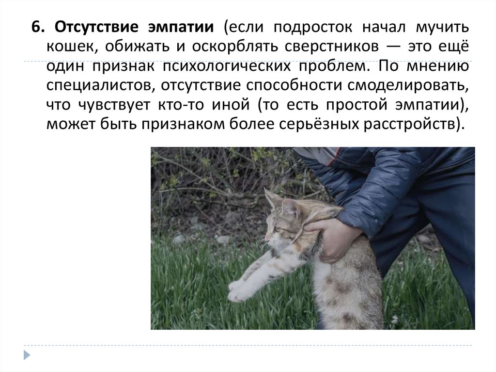 6. Отсутствие эмпатии (если подросток начал мучитькошек, обижать и оскорблять сверстников — это ещё