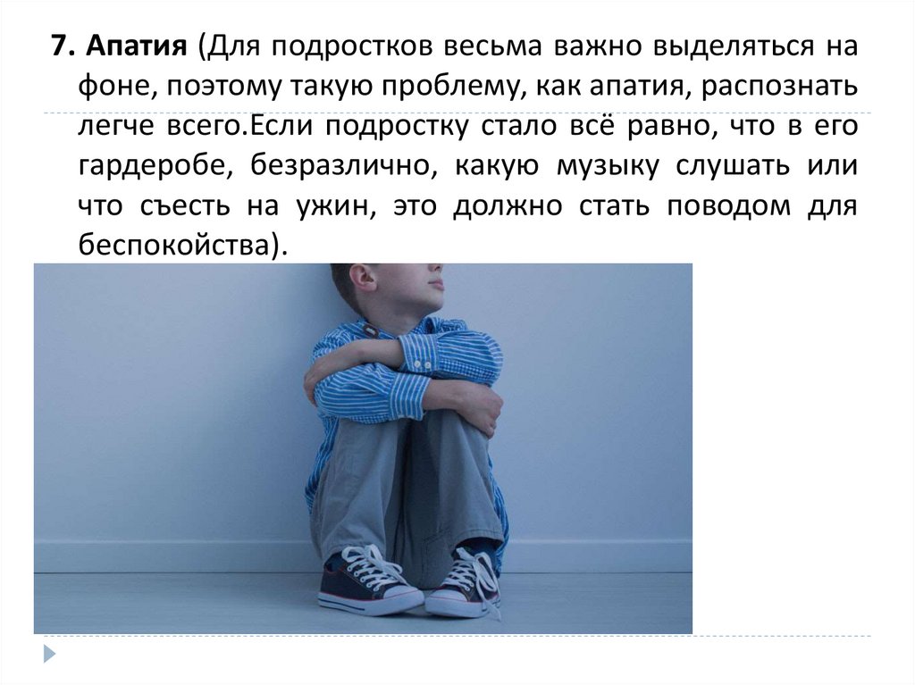 7. Апатия (Для подростков весьма важно выделяться нафоне, поэтому такую проблему, как апатия, распознать