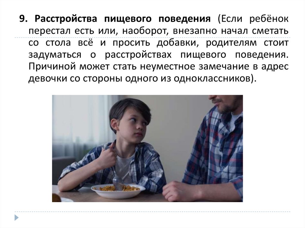 9. Расстройства пищевого поведения (Если ребёнокперестал есть или, наоборот, внезапно начал сметать