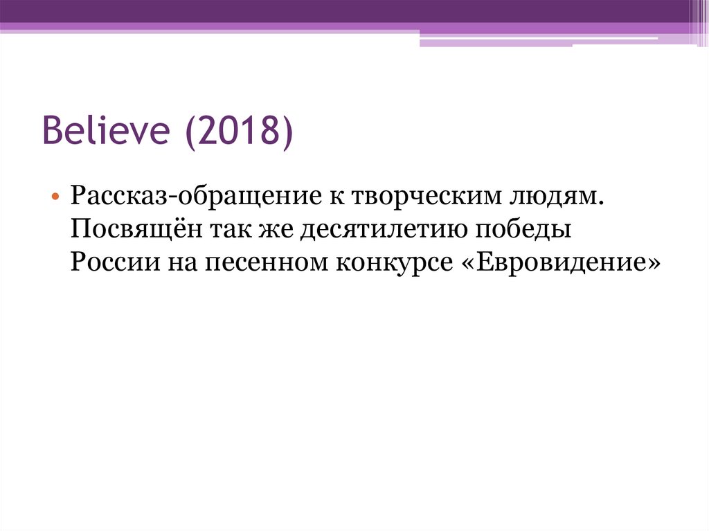 Believe (2018)• Рассказ-обращение к творческим людям.