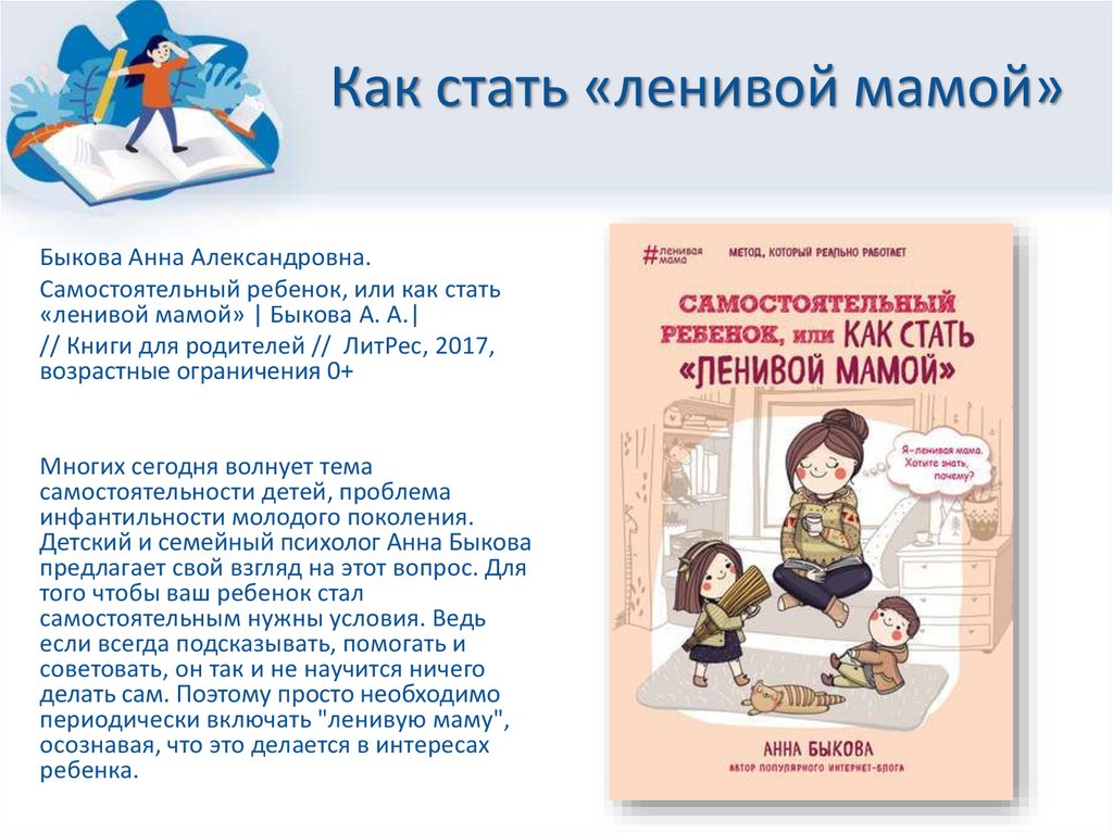Как стать ленивой мамой: https://www.litres.ru/a-a-bykova/samostoyatelnyyrebenok-ili-kak-stat-lenivoy-mamoy-18957375/
