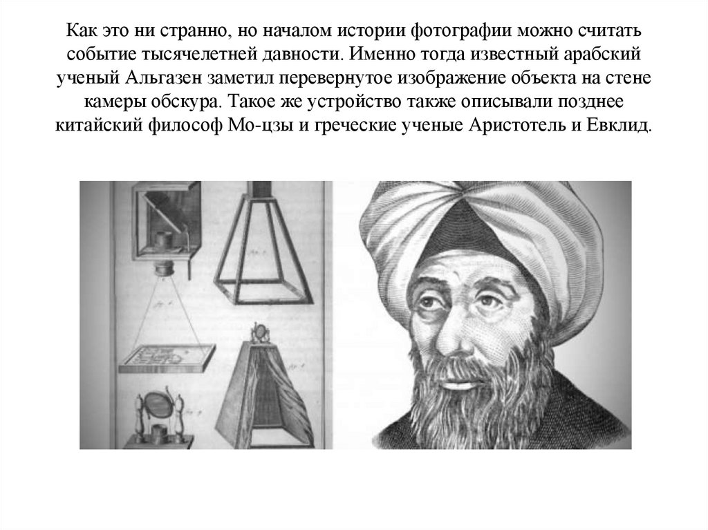 Как это ни странно, но началом истории фотографии можно считатьсобытие тысячелетней давности. Именно тогда известный арабский