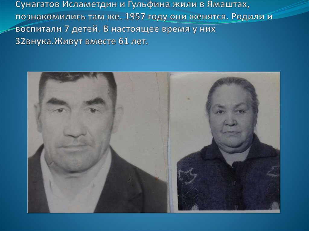 Хадиятов Миннибай и Юмабика познакомились 1971 г вЯмаштах. Миннибай работал в Леспромхозе а молодая