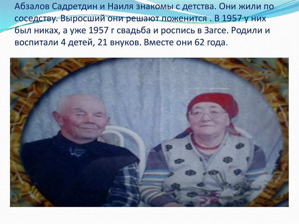 Абзалов Садретдин и Наиля знакомы с детства. Они жили пососедству. Выросший они решают поженится . В 1957 у них