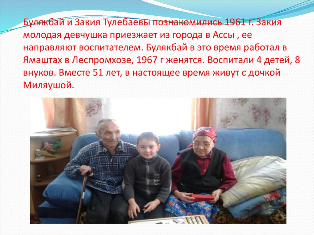 Булякбай и Закия Тулебаевы познакомились 1961 г. Закиямолодая девчушка приезжает из города в Ассы , ее