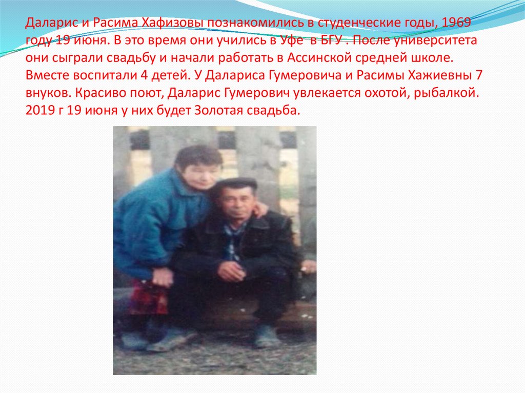 внуков. Красиво поют, Даларис Гумерович увлекается охотой, рыбалкой.
