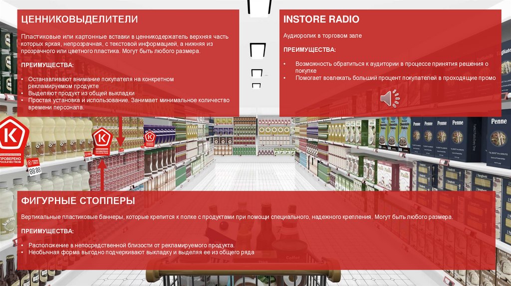 Хорошо заметны за счет крупного размера и размещения на выкладке рекламируемого