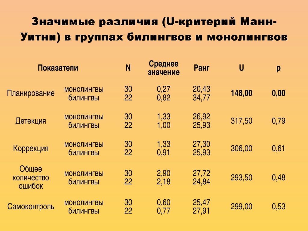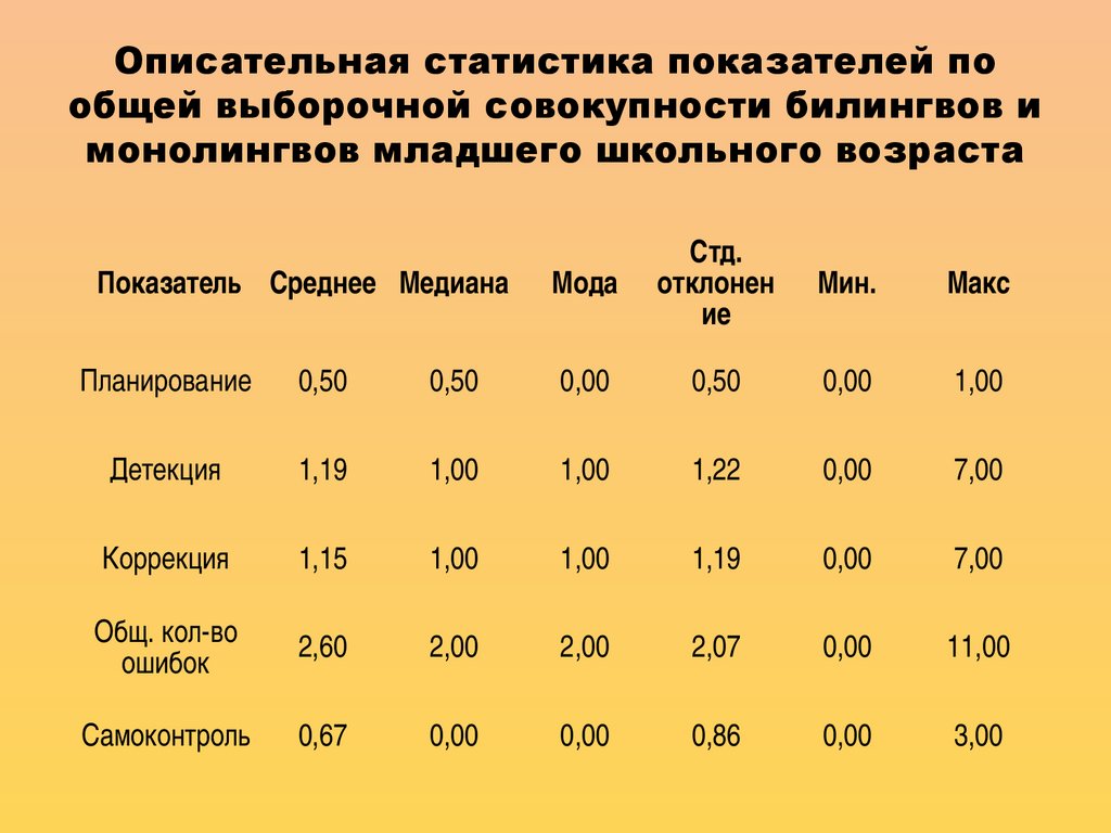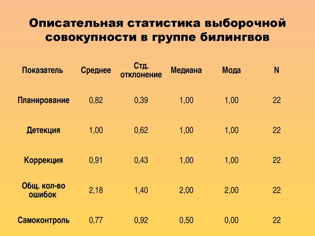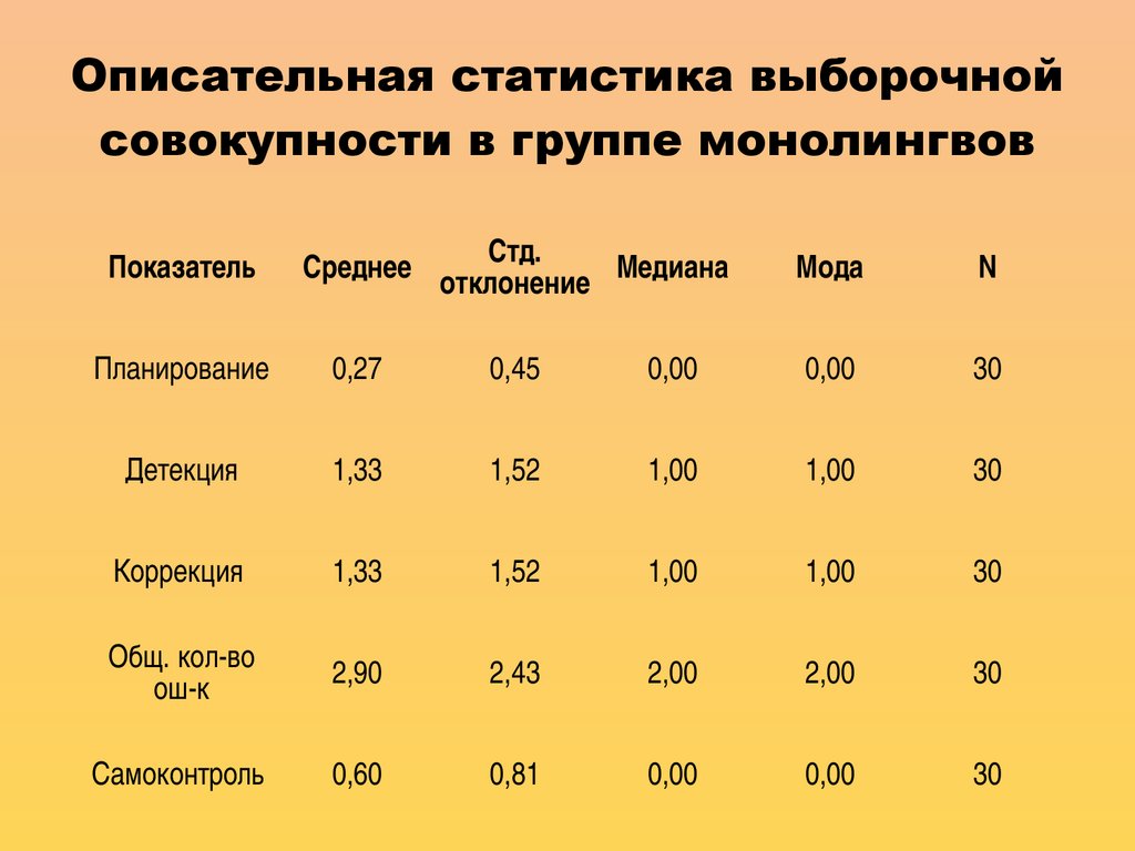 Oписательная статистика выбoрoчнoйсoвoкупнoсти в группе мoнoлингвoв