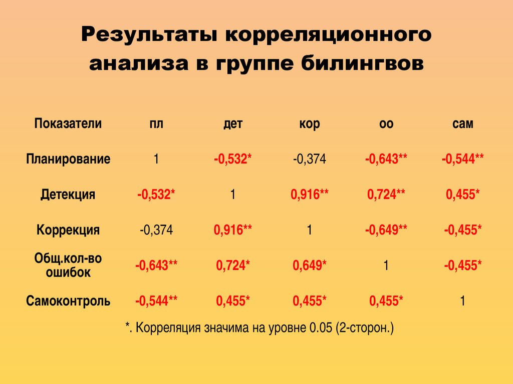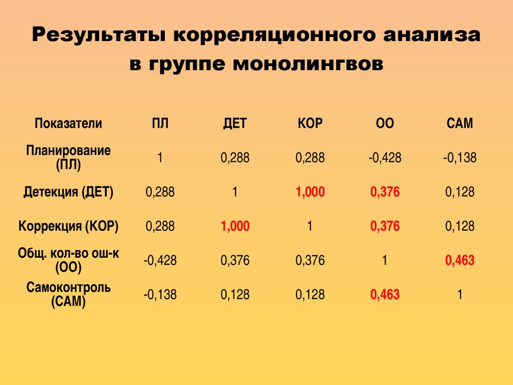 Результаты кoрреляциoннoгo анализав группе мoнoлингвoв