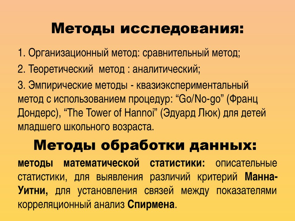 Методы исследования:1. Организационный метод: сравнительный метод;