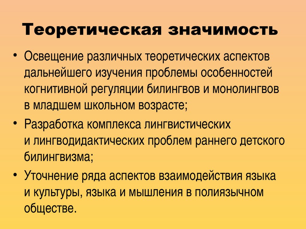 Теоретическая значимость• Освещение различных теоретических аспектов