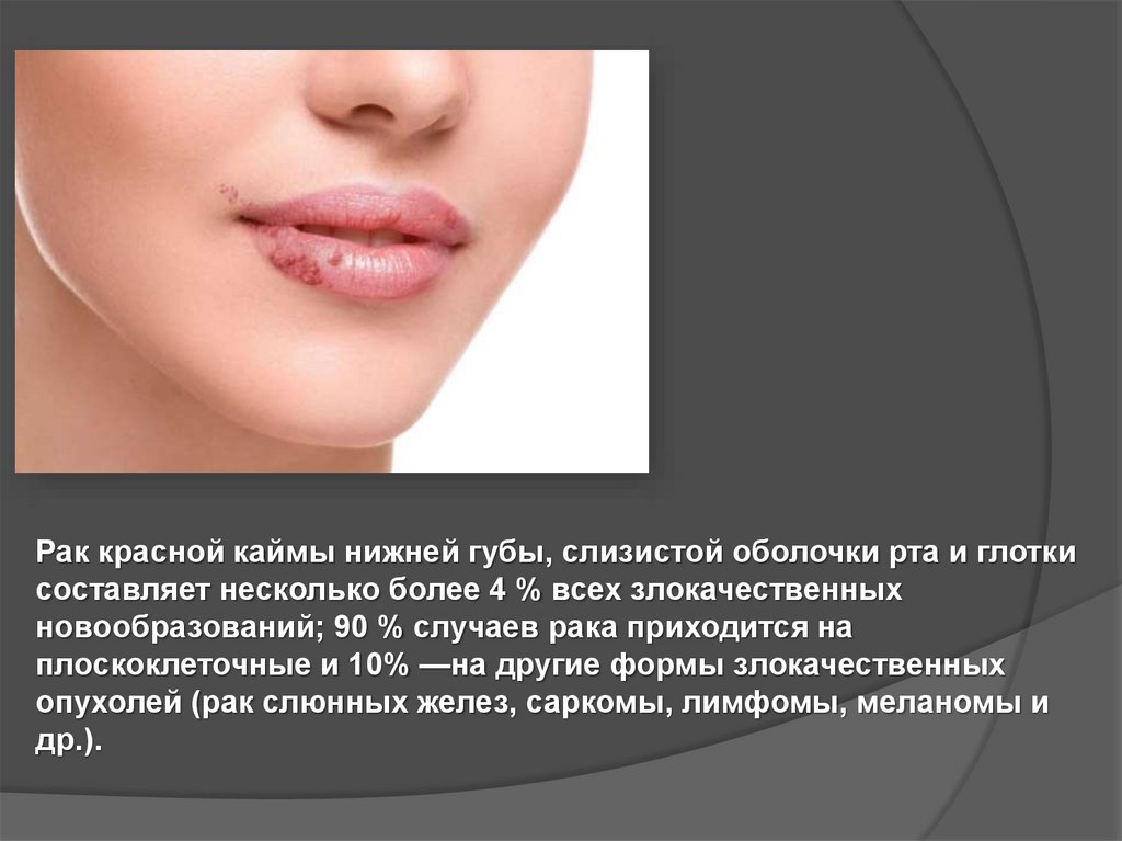 Рак красной каймы нижней губы, слизистой оболочки рта и глоткисоставляет несколько более 4 % всех злокачественных