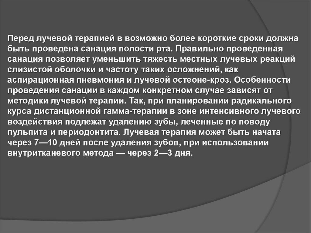 Перед лучевой терапией в возможно более короткие сроки должнабыть проведена санация полости рта. Правильно проведенная