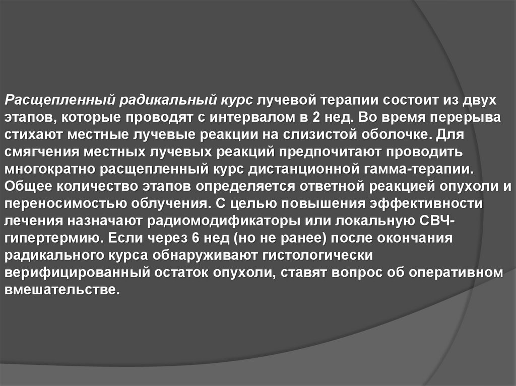Расщепленный радикальный курс лучевой терапии состоит из двухэтапов, которые проводят с интервалом в 2 нед. Во время перерыва