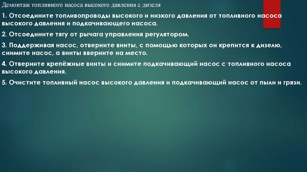 Демонтаж топливного насоса высокого давления с дизеля1. Отсоедините топливопроводы высокого и низкого давления от топливного насоса