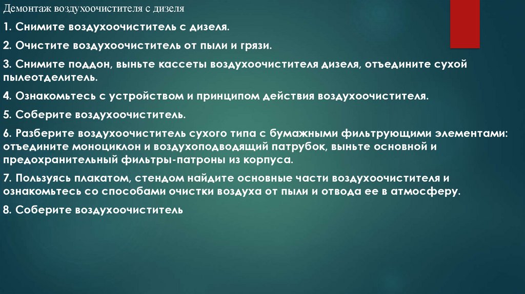 7. Пользуясь плакатом, стендом найдите основные части воздухоочистителя и