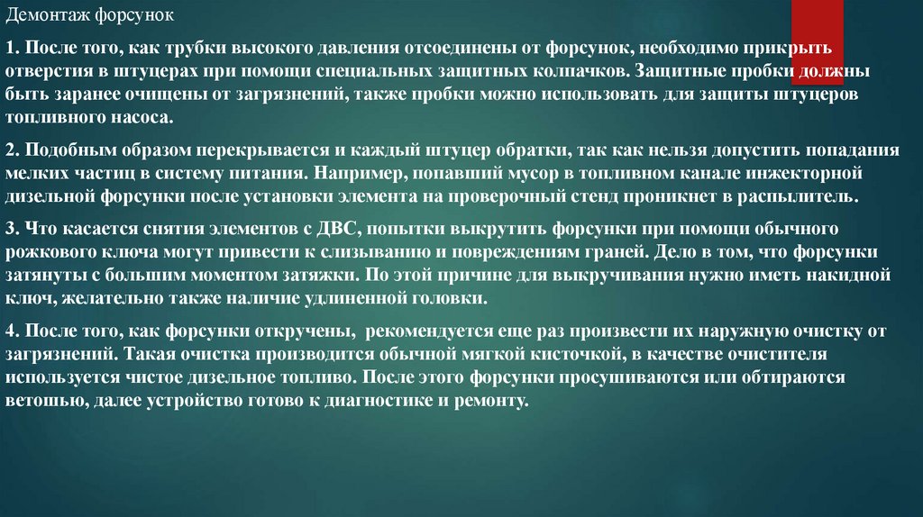 используется чистое дизельное топливо. После этого форсунки просушиваются или обтираются