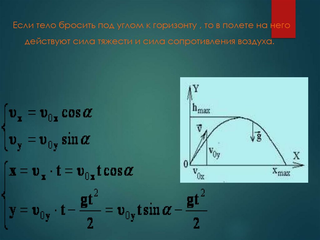 Если тело бросить под углом к горизонту , то в полете на негодействуют сила тяжести и сила сопротивления воздуха.