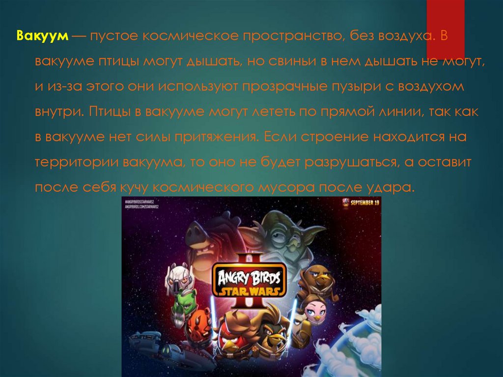 Вакуум — пустое космическое пространство, без воздуха. Ввакууме птицы могут дышать, но свиньи в нем дышать не могут,