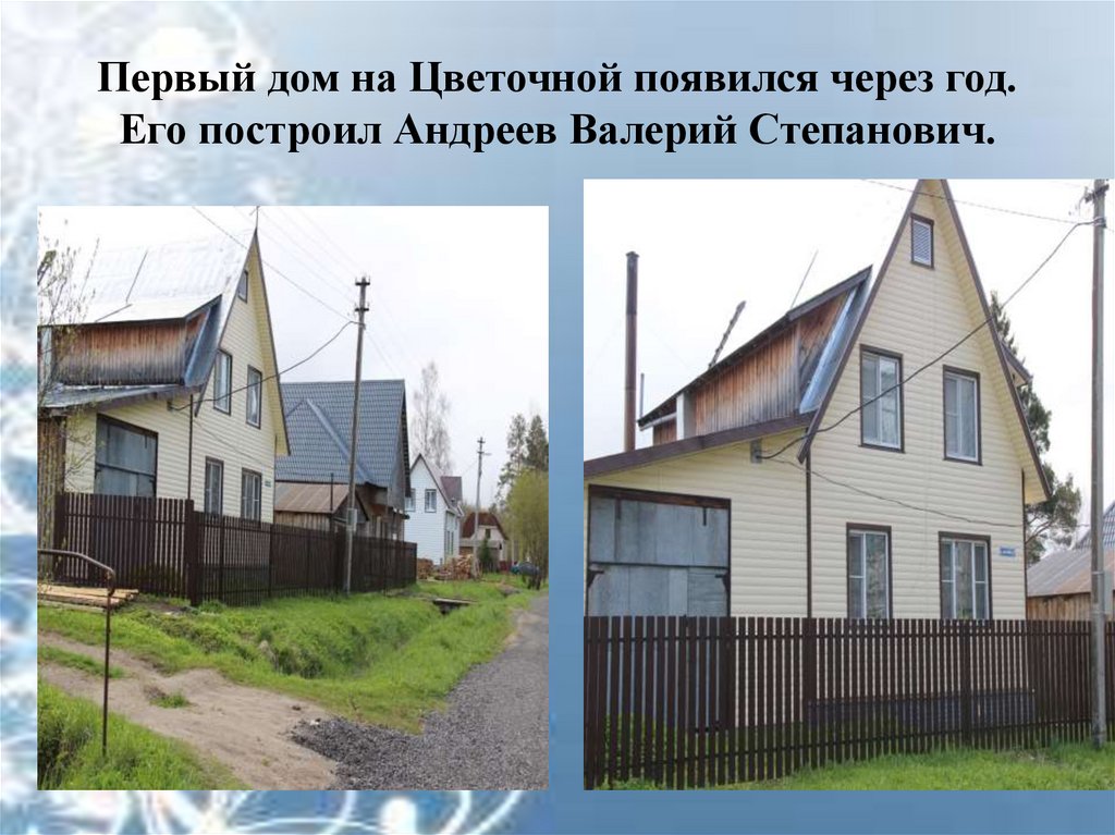 Первый дом на Цветочной появился через год.Его построил Андреев Валерий Степанович.