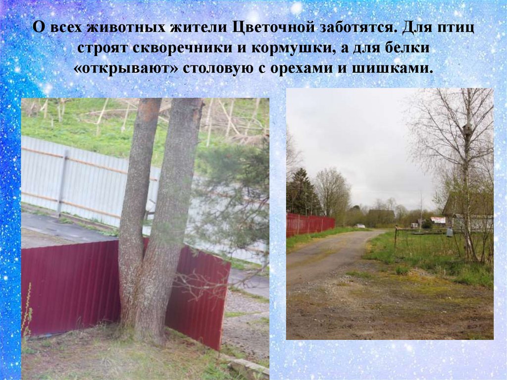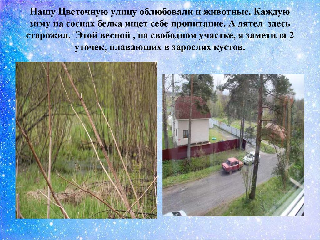 Нашу Цветочную улицу облюбовали и животные. Каждуюзиму на соснах белка ищет себе пропитание. А дятел здесь