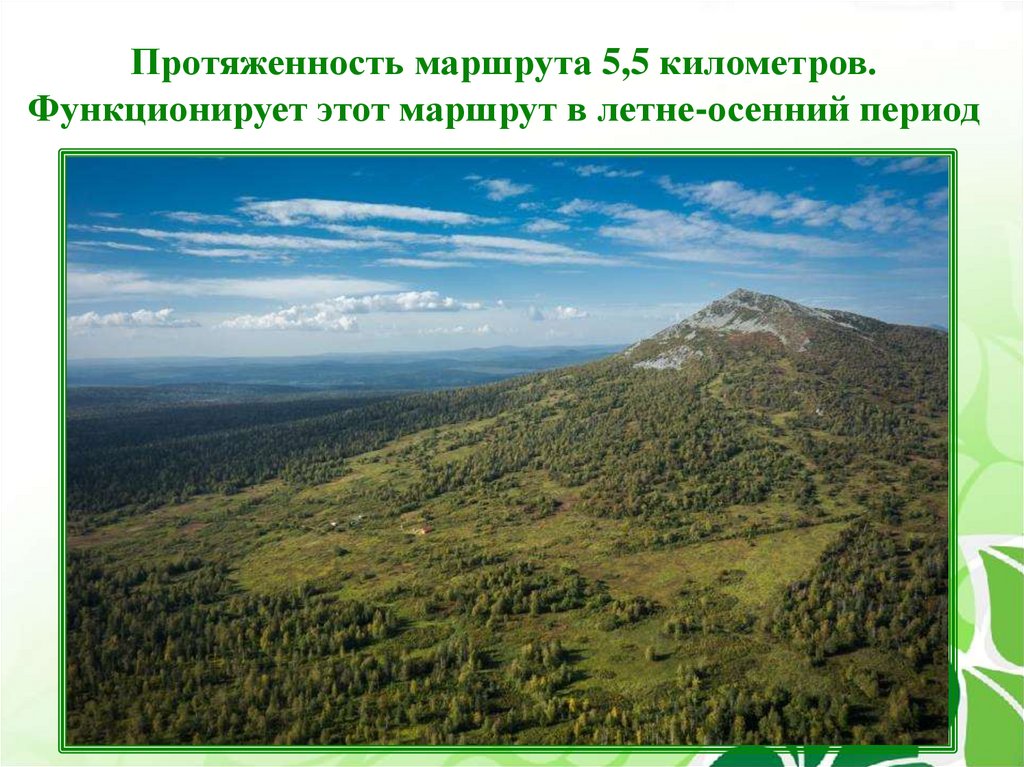 Протяженность маршрута 5,5 километров.Функционирует этот маршрут в летне-осенний период