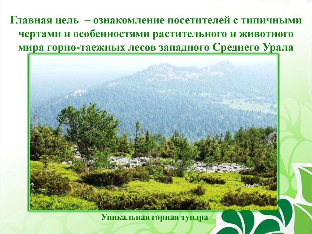 Главная цель – ознакомление посетителей с типичнымичертами и особенностями растительного и животного