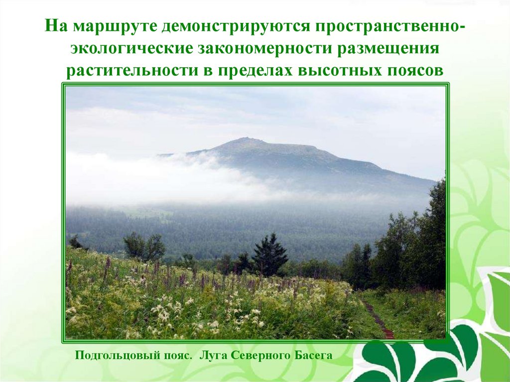 На маршруте демонстрируются пространственноэкологические закономерности размещениярастительности в пределах высотных поясов