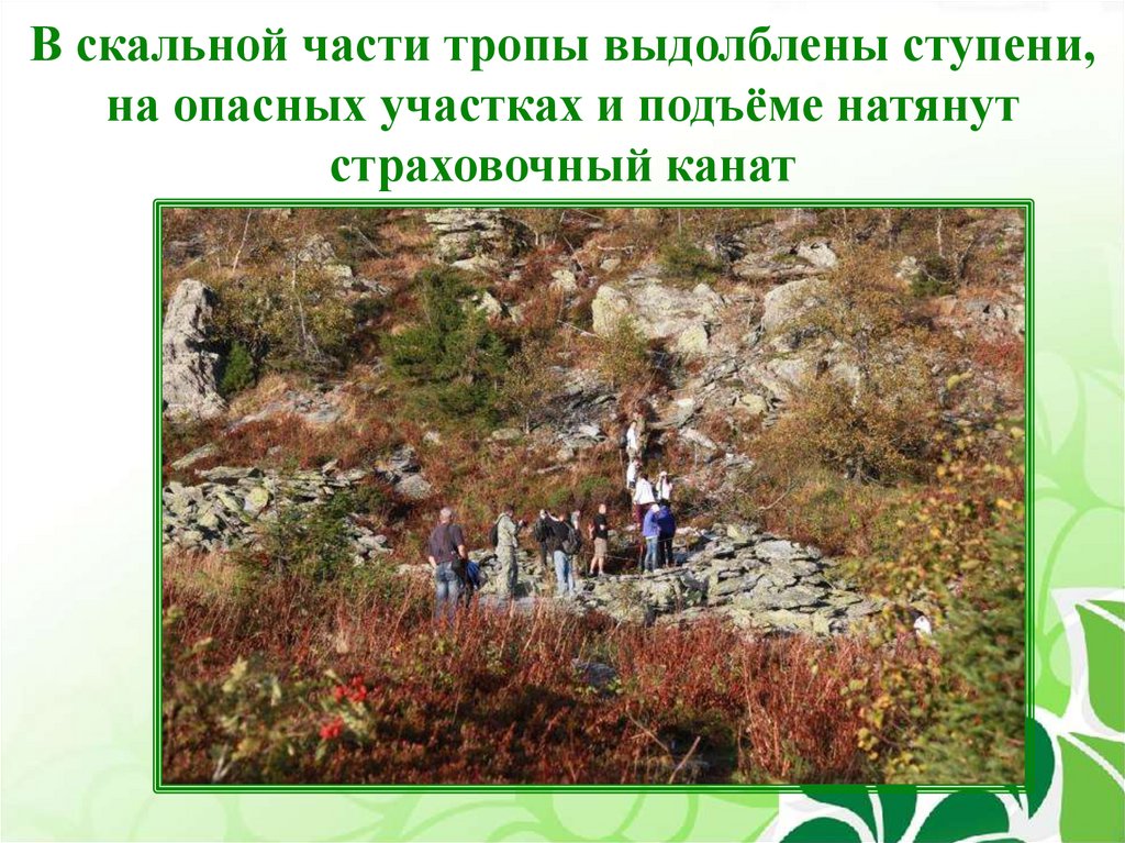 В скальной части тропы выдолблены ступени,на опасных участках и подъёме натянут