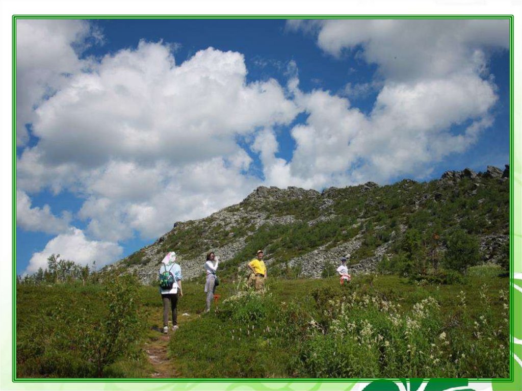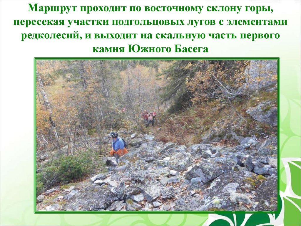 Маршрут проходит по восточному склону горы,пересекая участки подгольцовых лугов с элементами