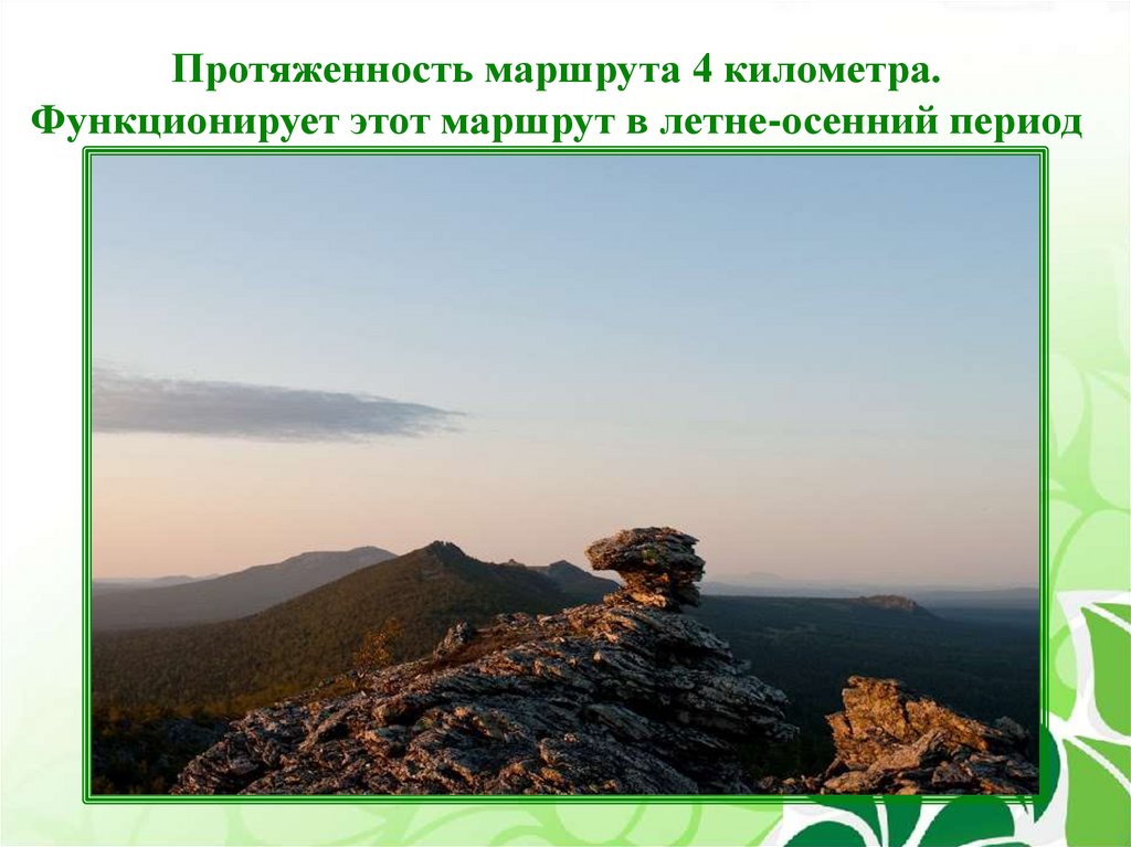 Протяженность маршрута 4 километра.Функционирует этот маршрут в летне-осенний период
